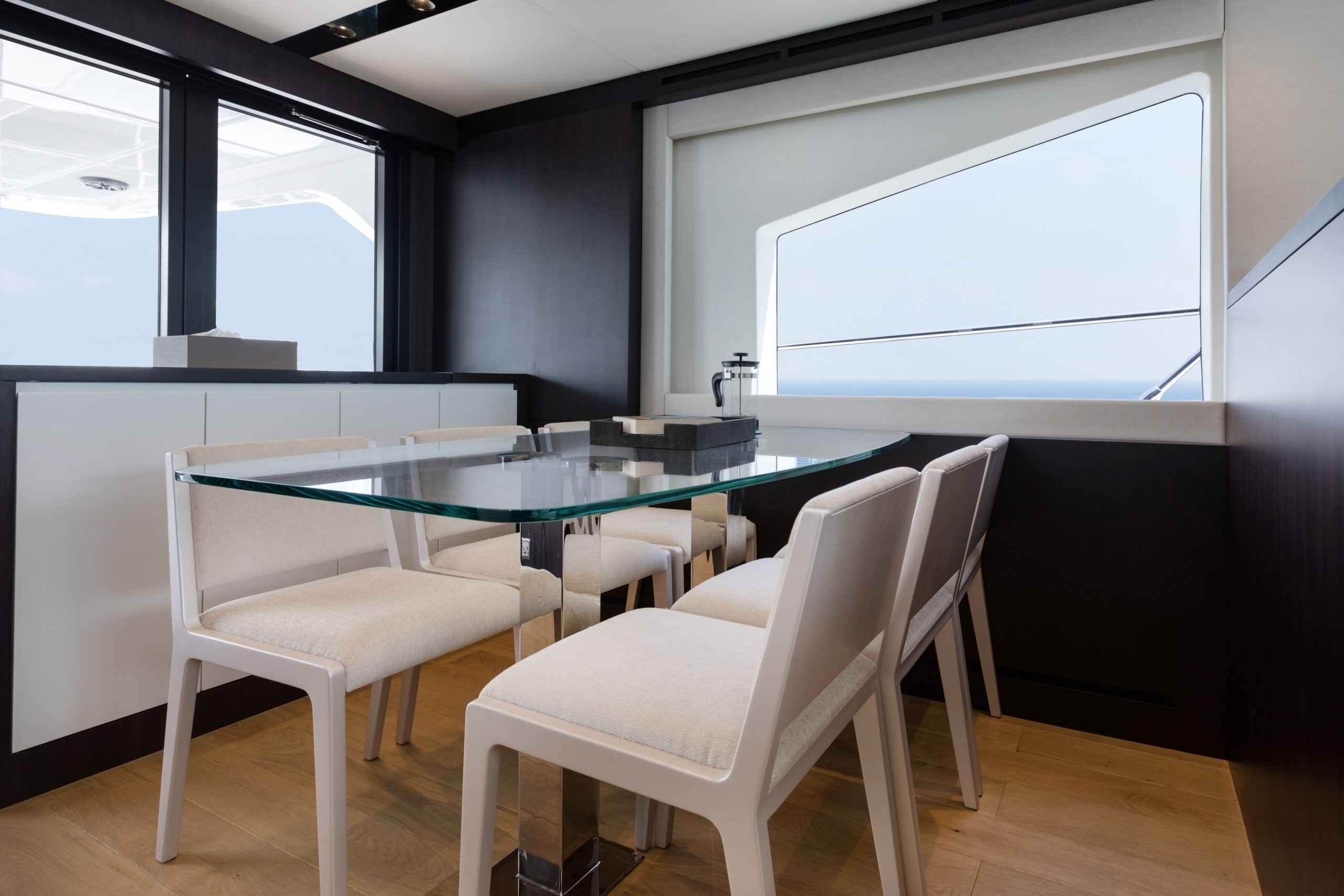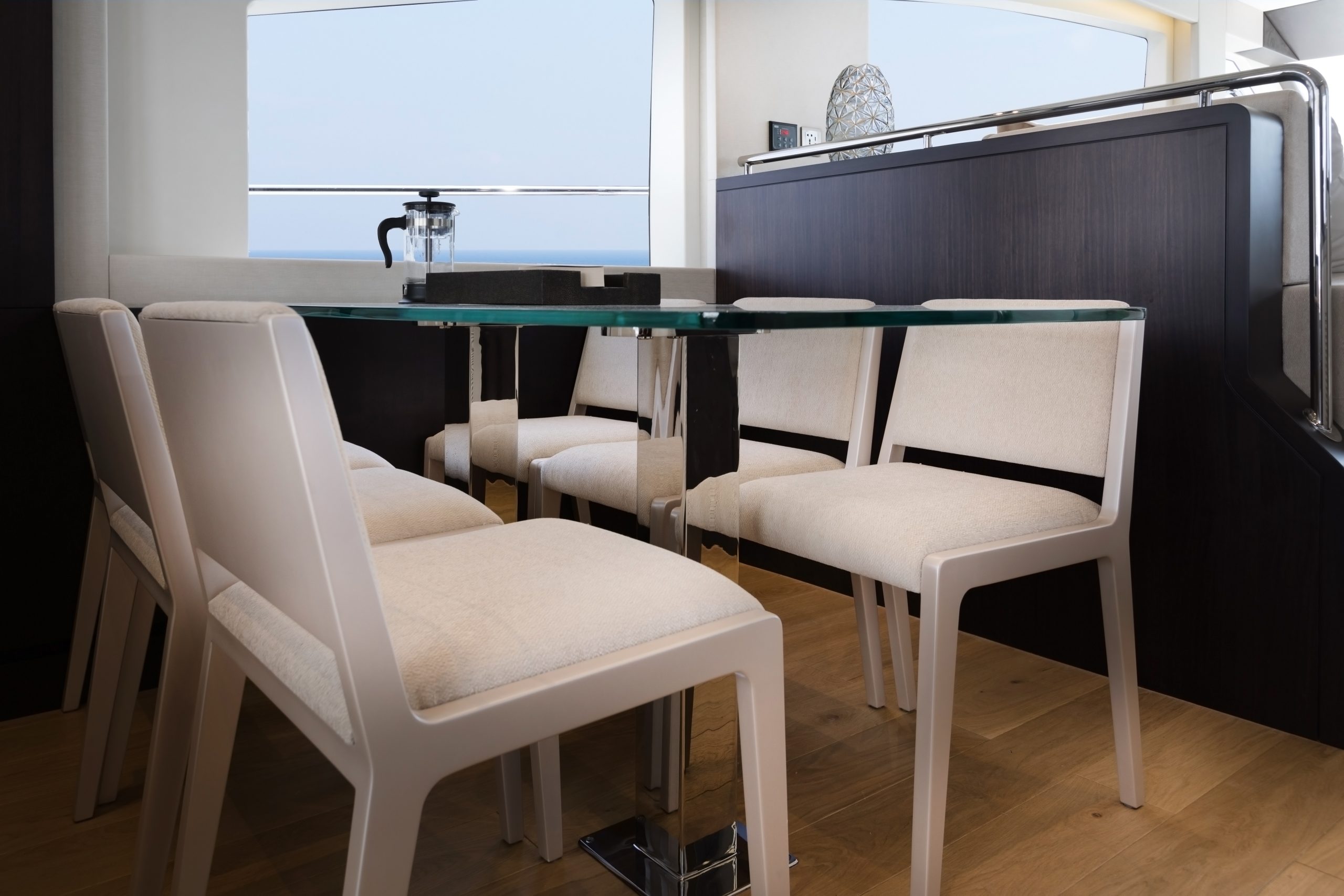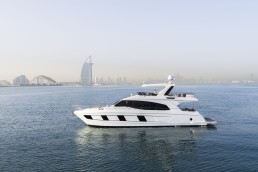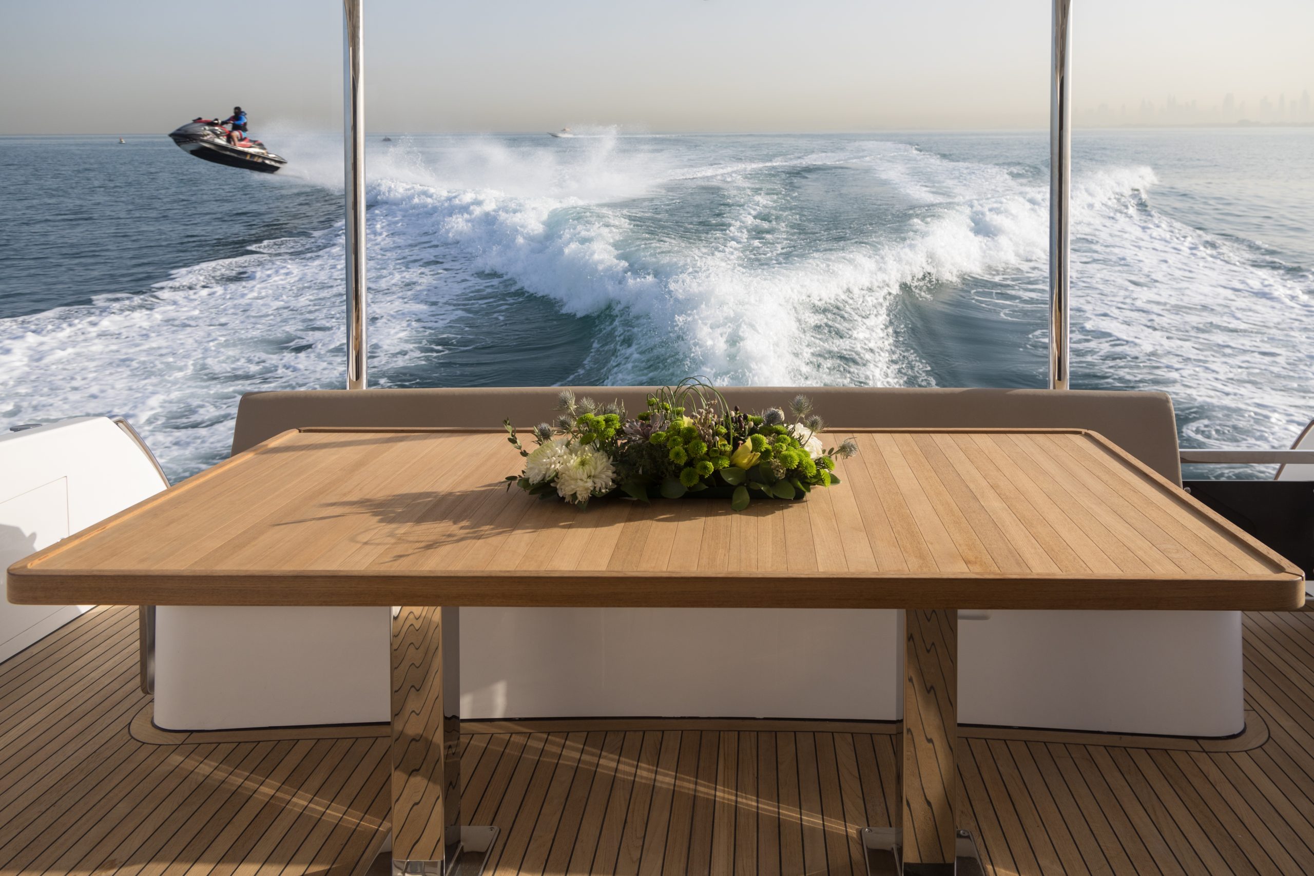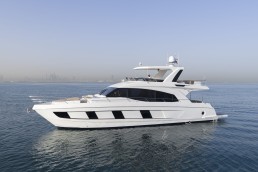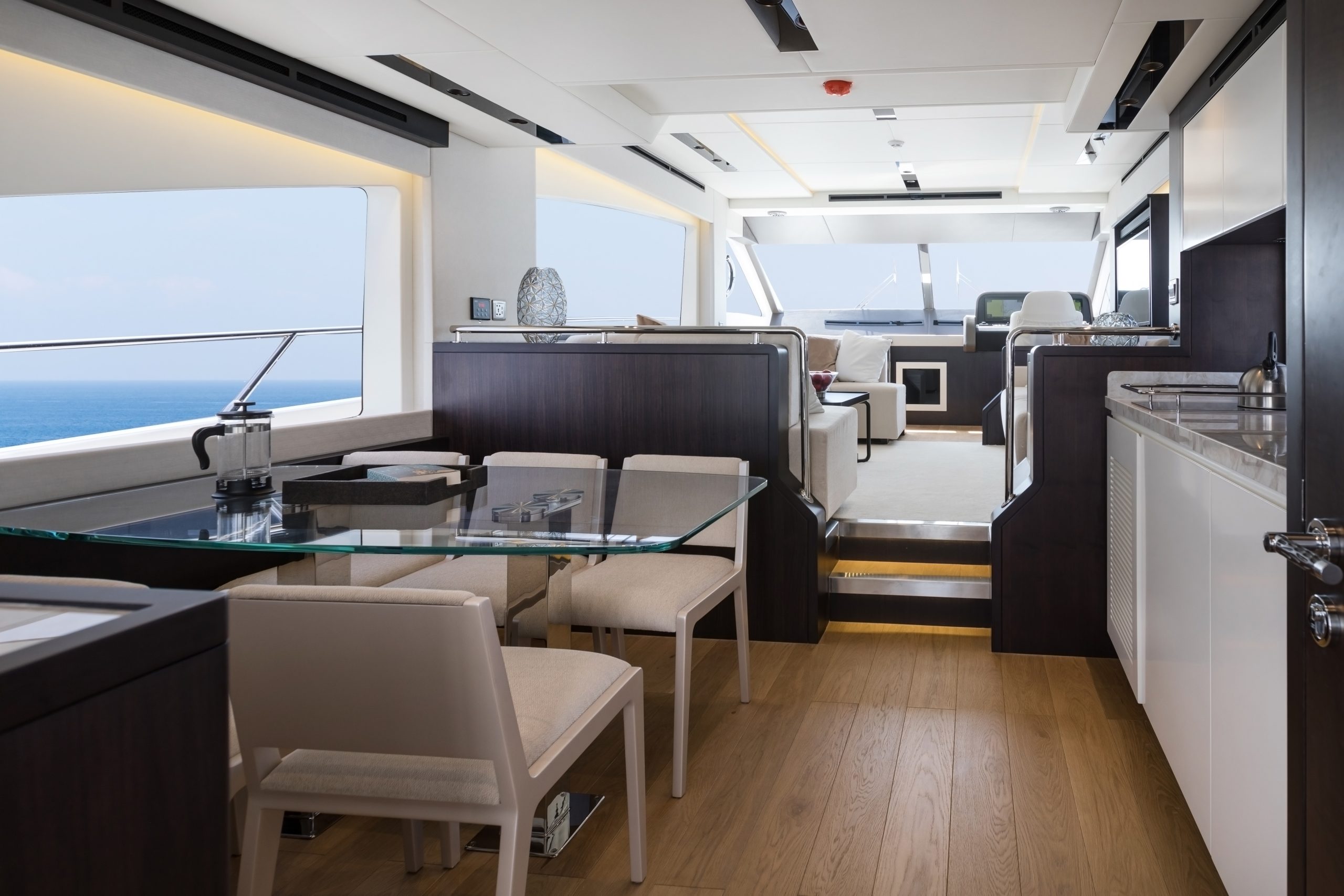 Điểm nhấn của mẫu du thuyền này là tầng lái nóc khoáng đạt, nơi mang lại tầm nhìn bao quát và không gian tắm nắng lý tưởng. Boong chính được thiết kế mở, kết nối nhuần nhuyễn giữa salon sang trọng và khu vực đuôi thuyền, tạo nên bối cảnh tuyệt vời cho những buổi tiệc tùng hay phút giây thư giãn neo đậu giữa vịnh biển yên bình.