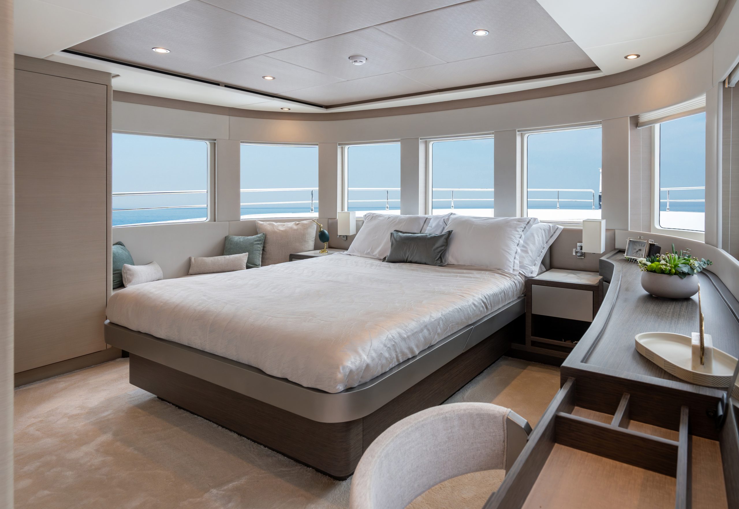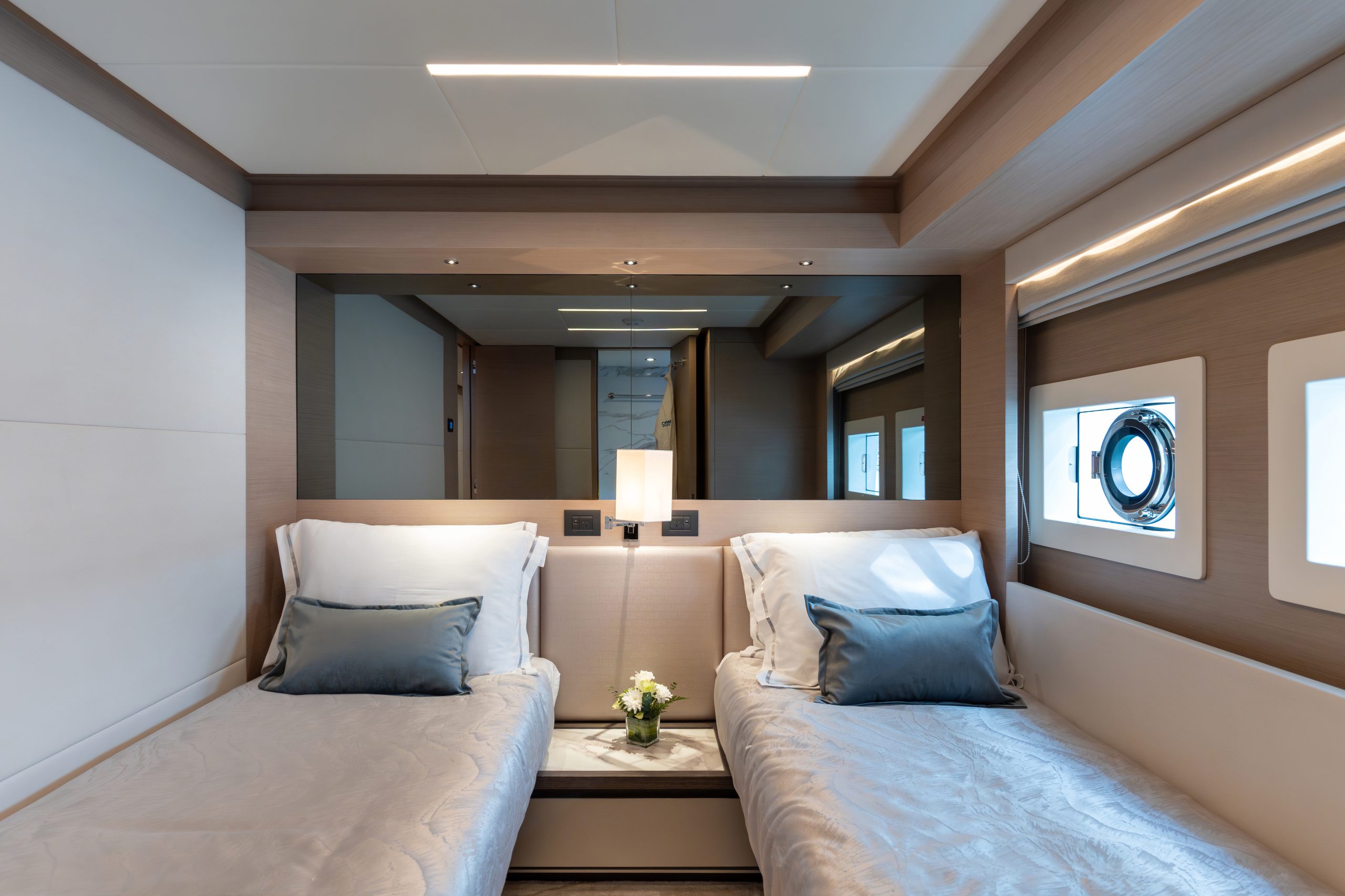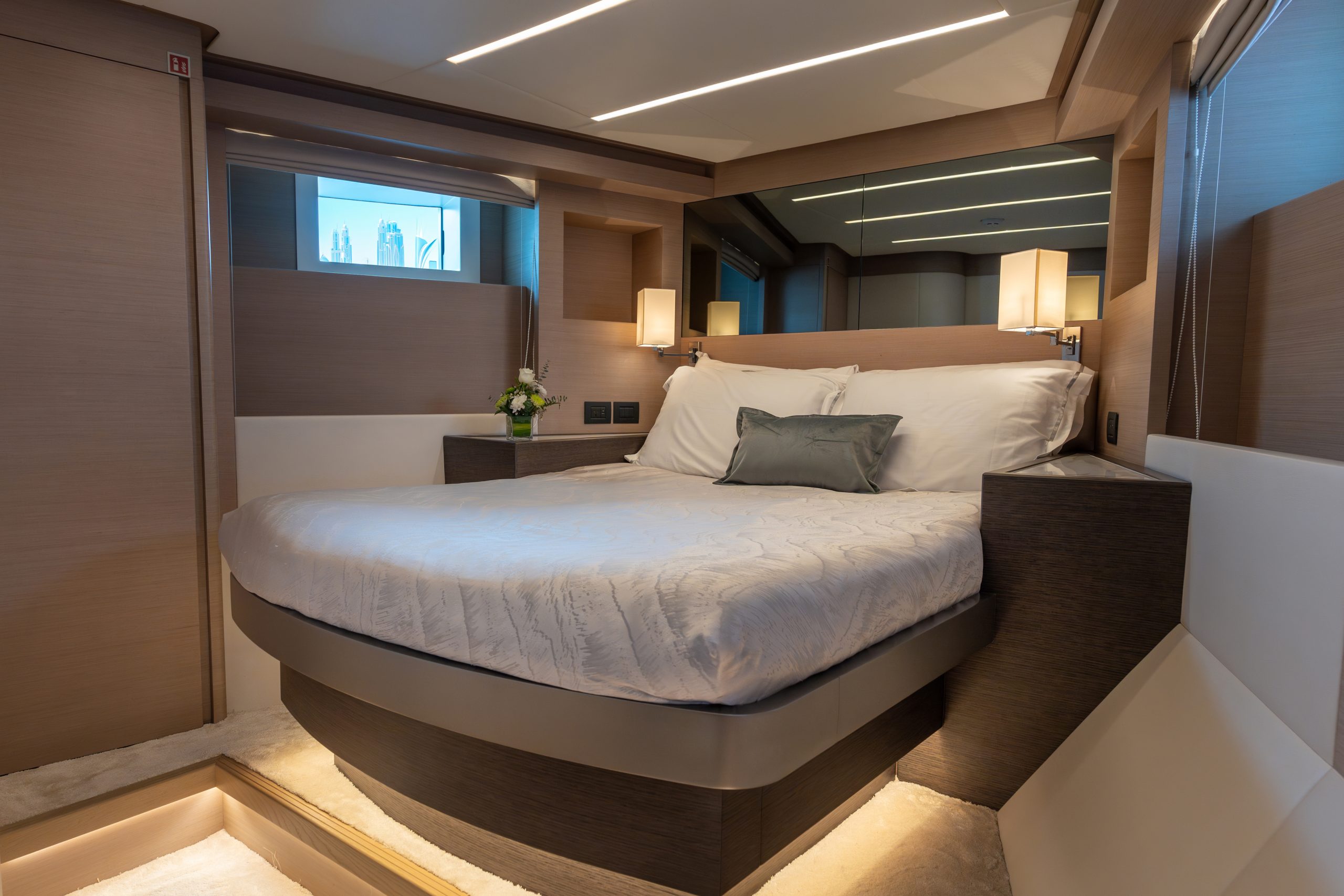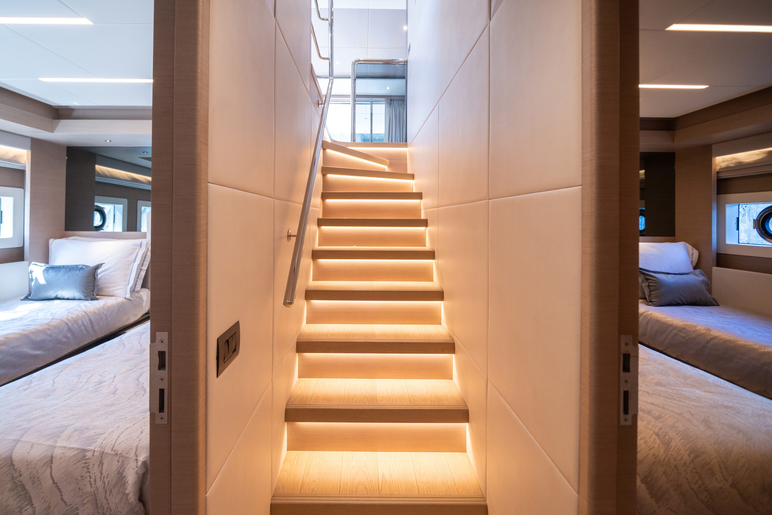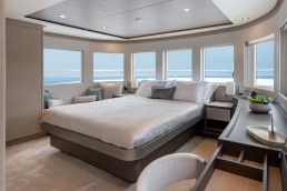 Không gian nghỉ ngơi được thiết kế tinh tế, đảm bảo sự sang trọng cho 10 thượng khách. Kết hợp cùng các boong rộng và những ô cửa kính panorama bao quanh, Nomad 75 biến mỗi khoảnh khắc trên tàu thành một bức tranh thiên nhiên sống động, nơi bạn có thể thu trọn vẻ đẹp của biển trời vào tầm mắt.